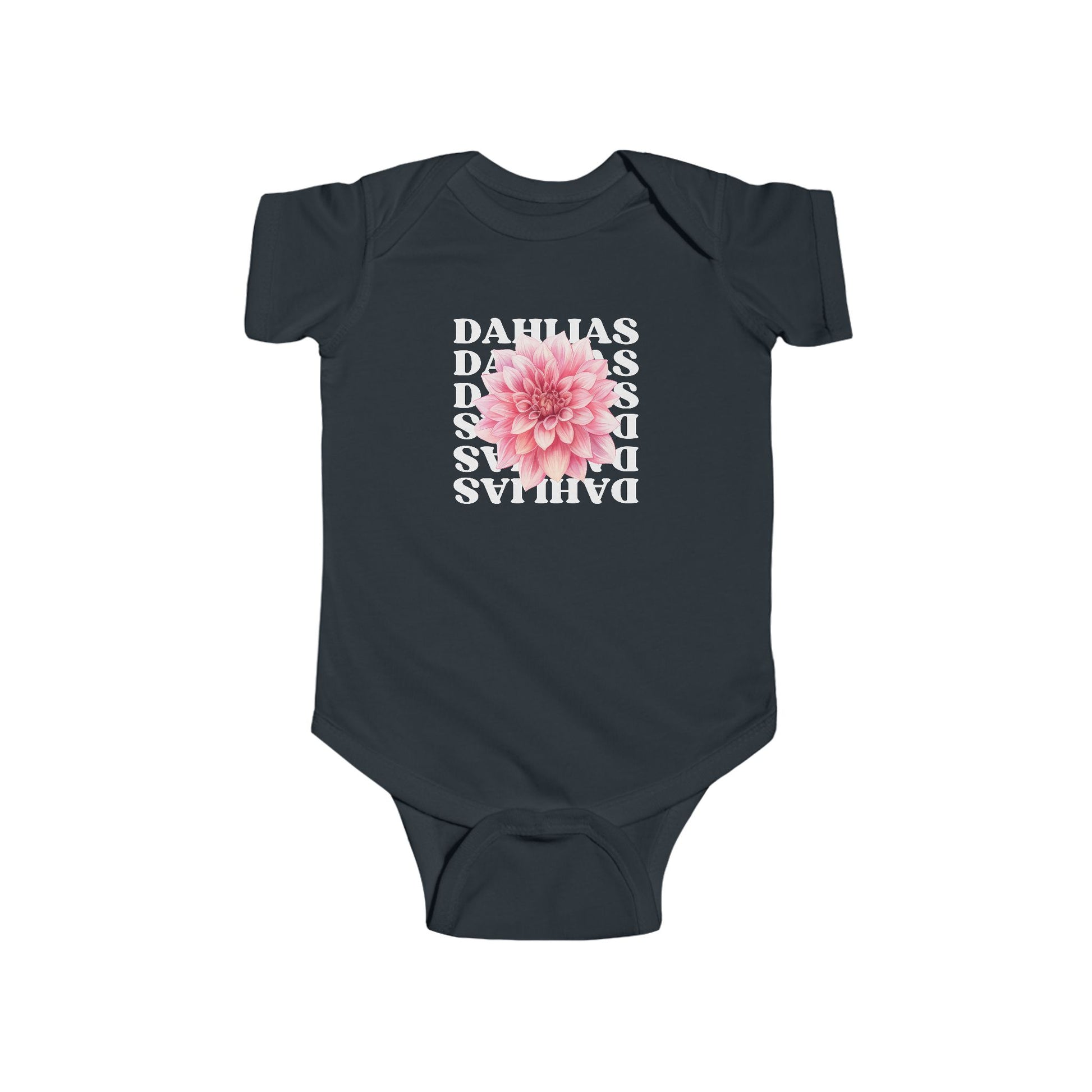 A cute and cheerful baby onesie featuring a radiantly beautiful dahlia bloom design. Perfect for adding a touch of happiness to your little one's wardrobe. Ideal for parents looking for a unique and joyful outfit for their infant. Great for holidays, baby showers, and everyday wear. Design on the back celebrates Love Every Day!